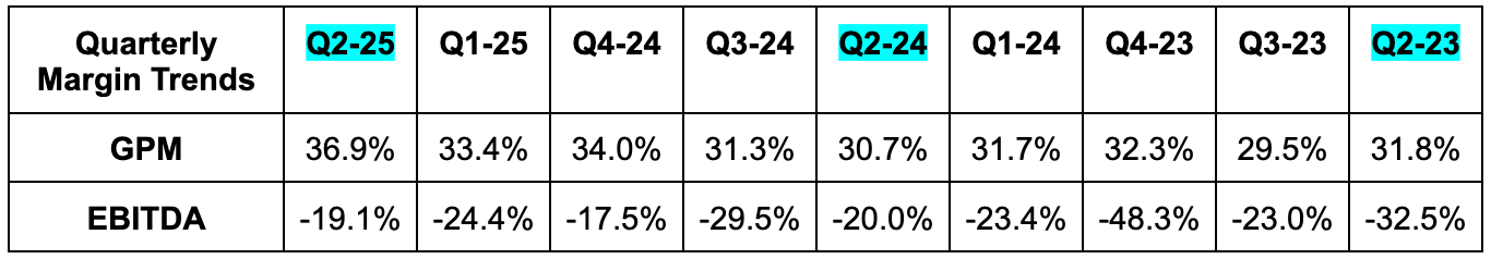 - Beat 35% GPM guidance & identical estimates by 190 bps.