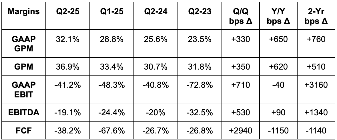 - Beat 31% GAAP GPM guidance by 110 bps.