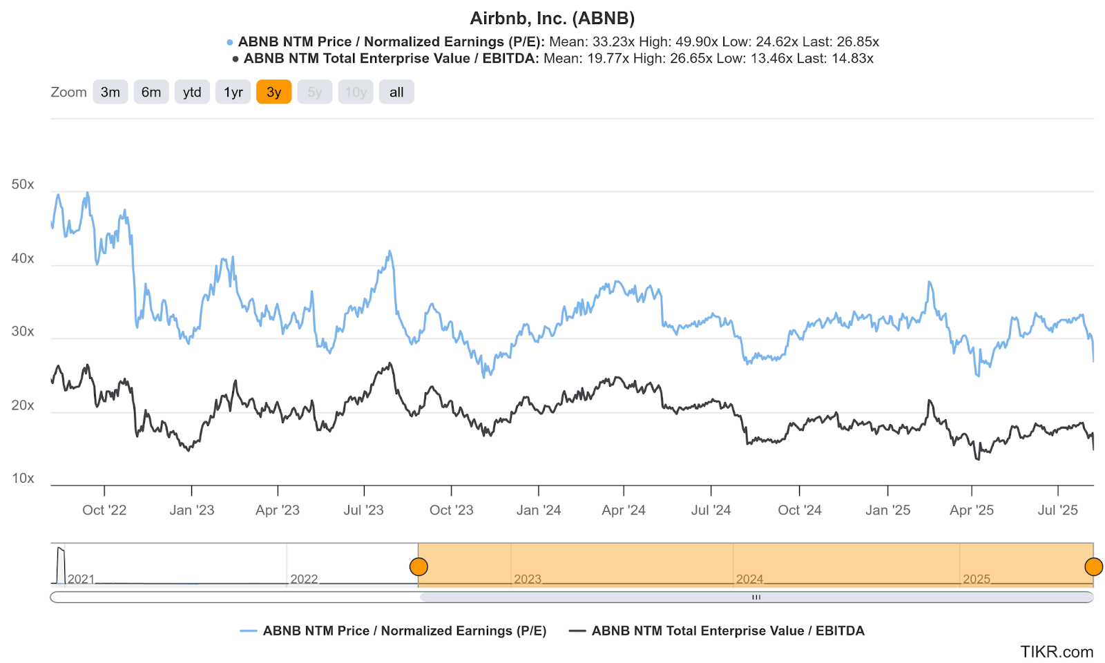 ABNB trades for 27x GAAP EPS and 15x EBITDA. GAAP EPS is expected to grow by 3% this year and 12% next year. EBITDA is expected to grow by 5% this year and by 11% next year.