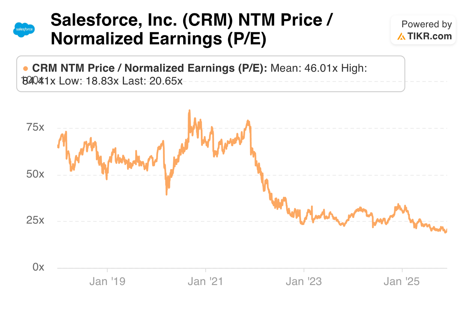 CRM trades for 21x forward EPS. EPS is expected to grow by 15.4% this year and by 10.5% next year.