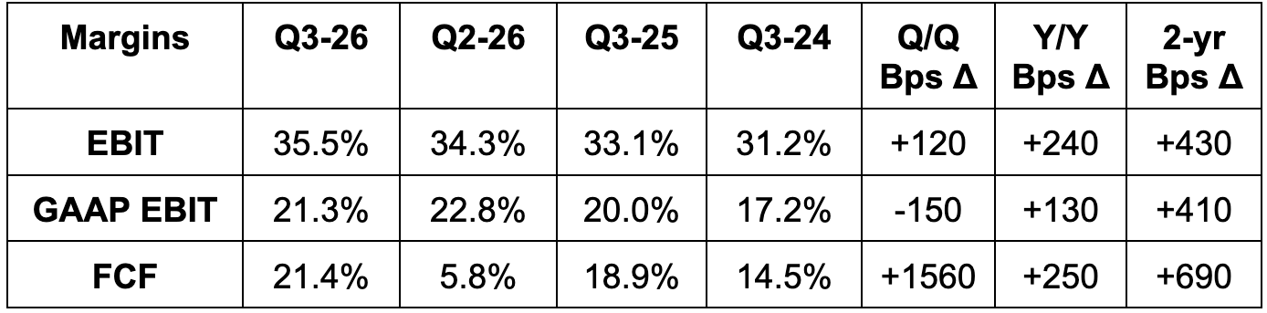 - For the year, demand growth guidance was raised with the help of M&A. EBIT margin guidance was maintained. EPS guidance was raised by the size of the Q3 beat.