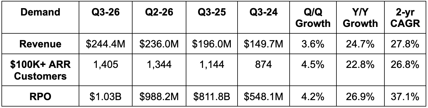 - Missed billings estimates by 3.8%. Roughly met RPO estimates.