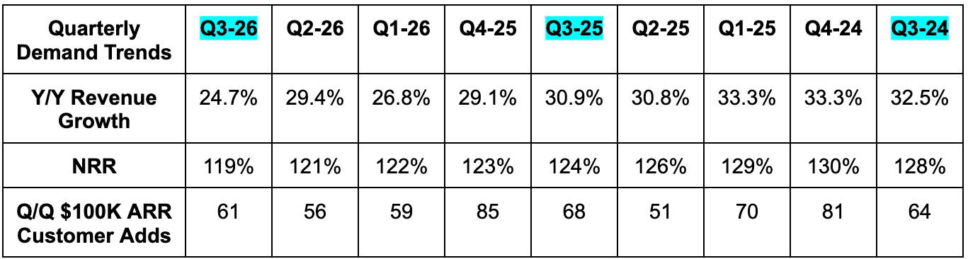 - Missed 120% net retention rate (NRR) with 119% NRR.