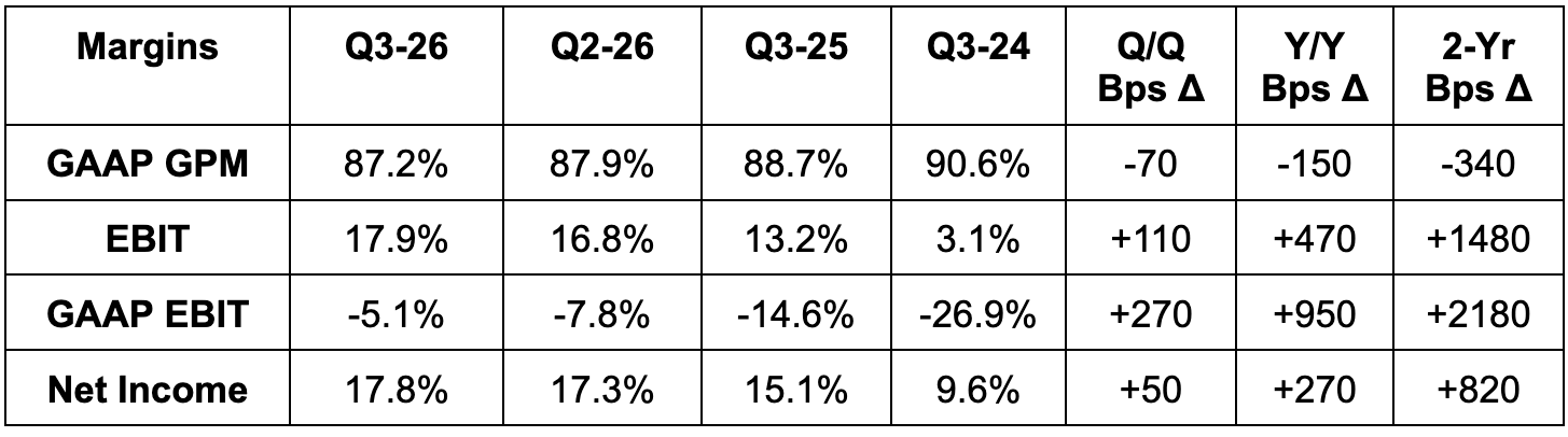 - Diluted share count fell by 1.5% Y/Y.