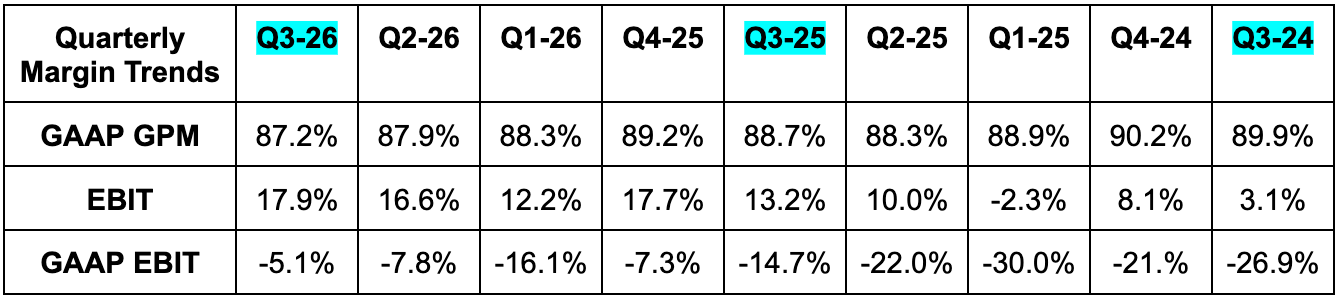 - Missed 89.9% GPM estimates by 130 bps.