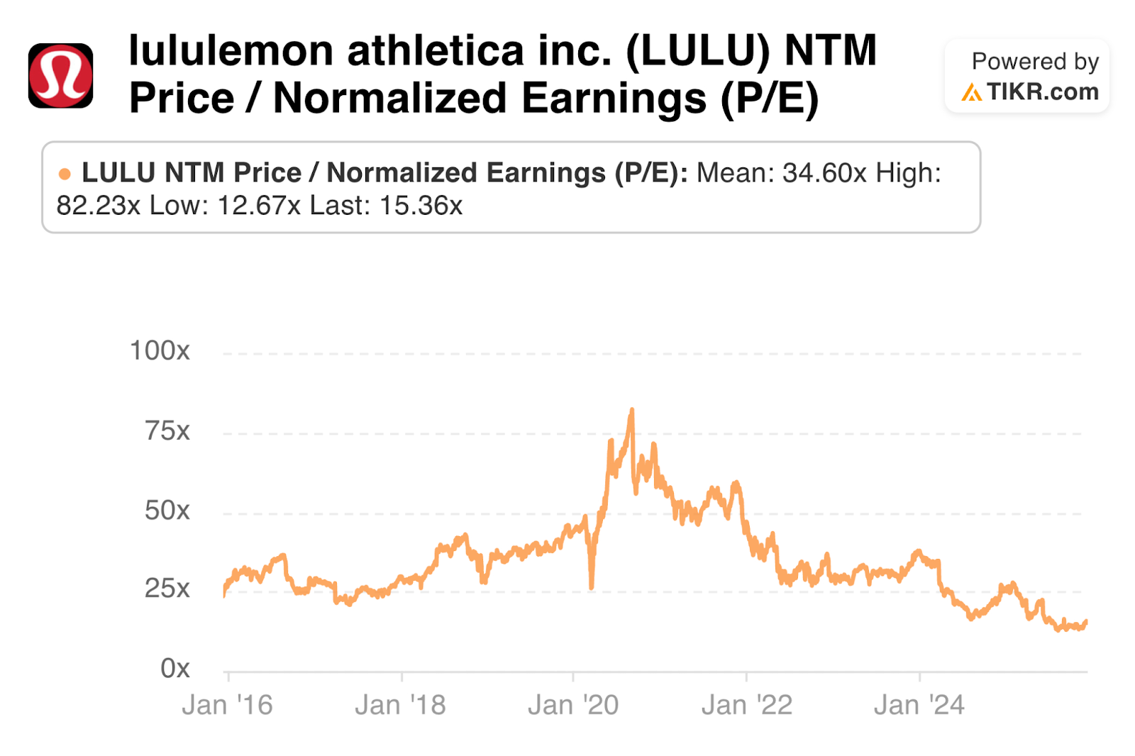 LULU trades for 15x forward EPS. EPS is expected to grow by -11% this year, -0.5% next year and 5.7% the year after.