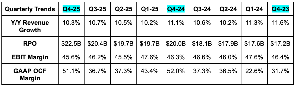 - Set annual revenue guidance at $26B, beating estimates by 0.4%.