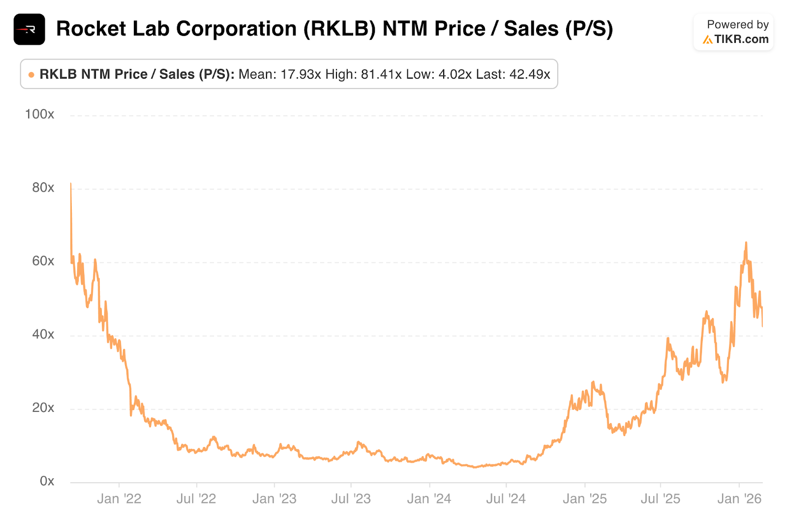 RKLB trades for 42x forward sales. They are expected to grow by 40% this year and by 46% next year. They’re also expected to turn EBITDA positive this year. They trade for 220x 2027 EBITDA.