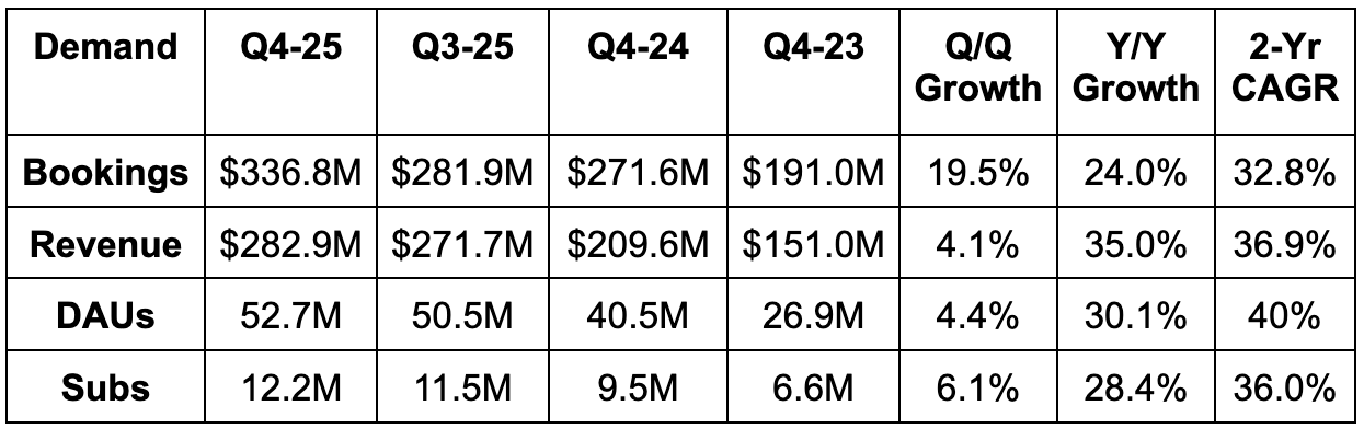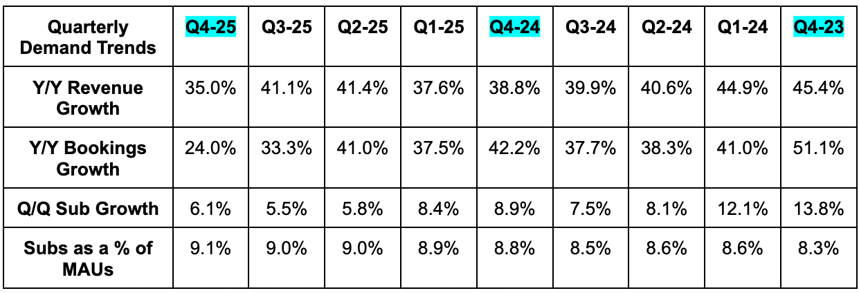 As Max readers know, I exited this position last year around $200/share after trimming much higher several times. The social media data I was closely tracking continued to deteriorate, and that is the single most important part of their growth engine. That should make the poor bookings guide, which is their forward-looking demand metric, unsurprising. They have not been able to recover any semblance of social media momentum even as growth comps get much easier. The team can say they’re prioritizing engagement, teaching quality and user growth over monetization in the near term. All I’d say is that if they were doing so effectively, user metrics would look a lot better. I have no interest in re-entering at any price based on current fundamental trends.