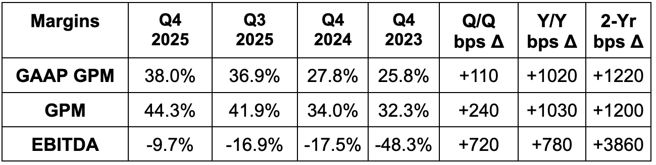 - Q1 40% GPM guidance missed estimates by 280 bps.