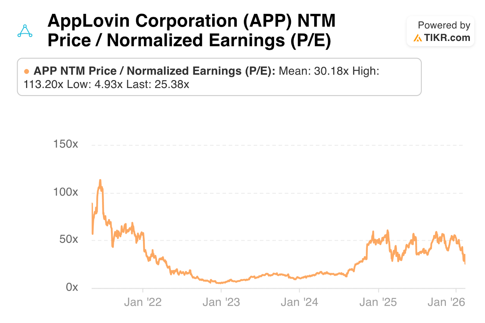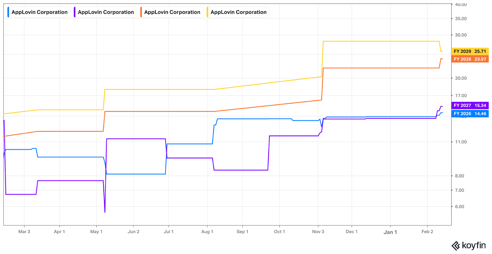 APP trades for 25x forward EPS. EPS is expected to grow by 61% this year and by 27% in 2027.