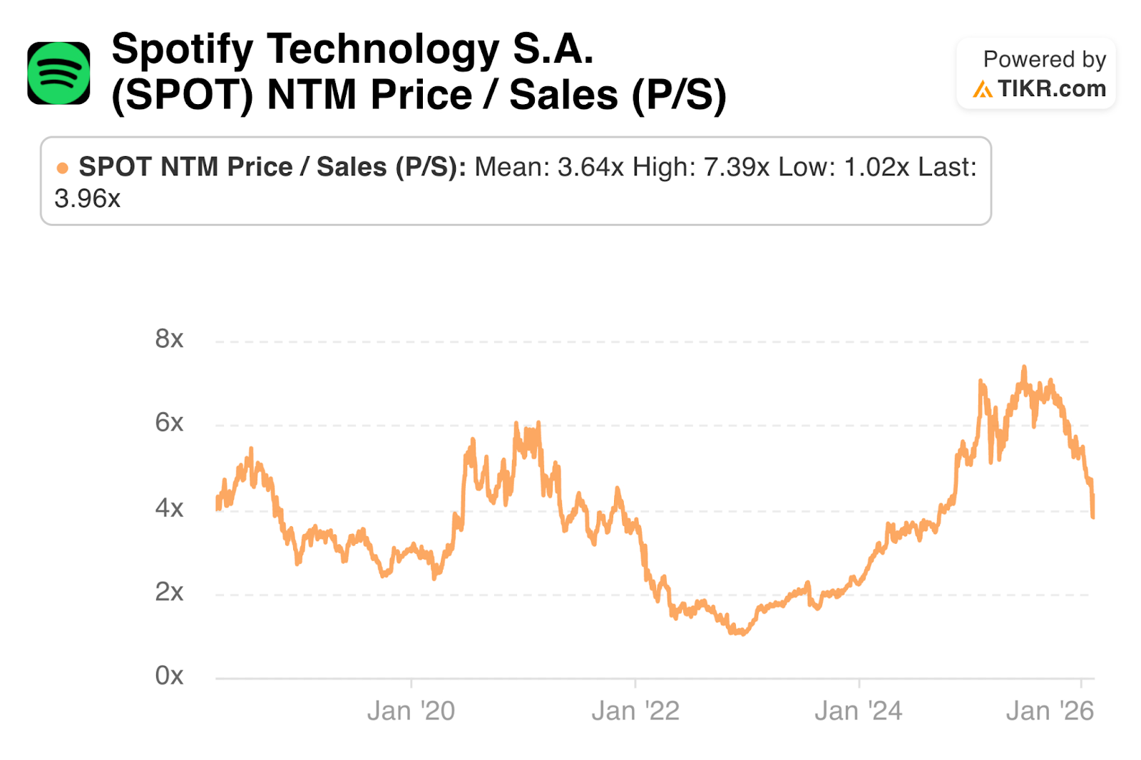 SPOT hasn’t been profitable for that long. I was able to include more years in the sale multiple chart below without the recently explosive profit inflection messing up the chart.