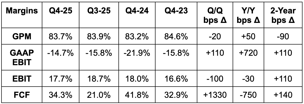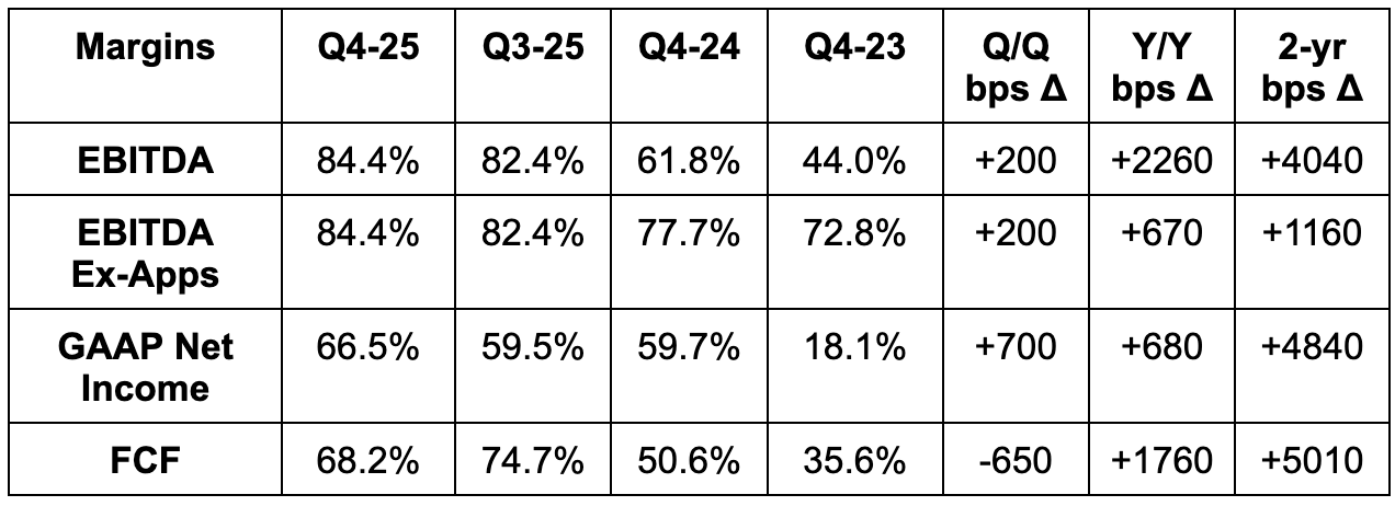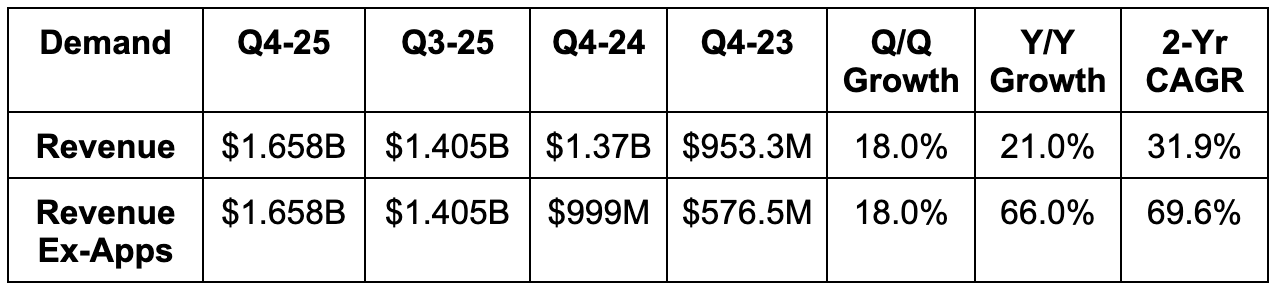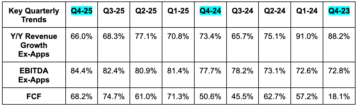 AppLovin sold its app segment last year. Comps are still normalizing, so I think it’s more valuable to focus on ex-Apps trends as the structural part of its current financials.