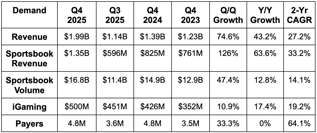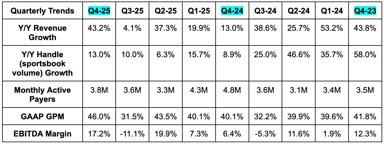 DraftKings can cite good Super Bowl downloads and retention for their prediction market product. They can charismatically mention they plan to be the leader here eventually. They can celebrate a 3-point sequential acceleration in Y/Y handle growth for Q4 despite that being due to their comp getting 16 points easier. They can talk about transaction revenue opportunities and the potential to create a sizable market maker business too. They can say guidance is finally appropriately conservative just like they did last year before sharply missing their supposedly prudent targets. They can say a lot of exciting things like they have for the last two years. I’m just too skeptical at this point to care with core business trends looking this fragile. It feels like their industry has sharply changed and their demonstrated ability to quickly evolve has been lacking. Yes, that's partially because of an unfair regulatory landscape... but that landscape is their reality. They have to win with the hand they're dealt, and I don't know if Robbins is capable of doing that.