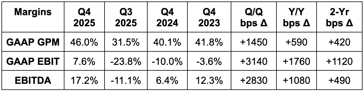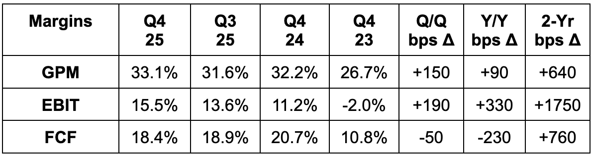 - Q1 32.8% GPM guidance beat estimates by 50 bps.
