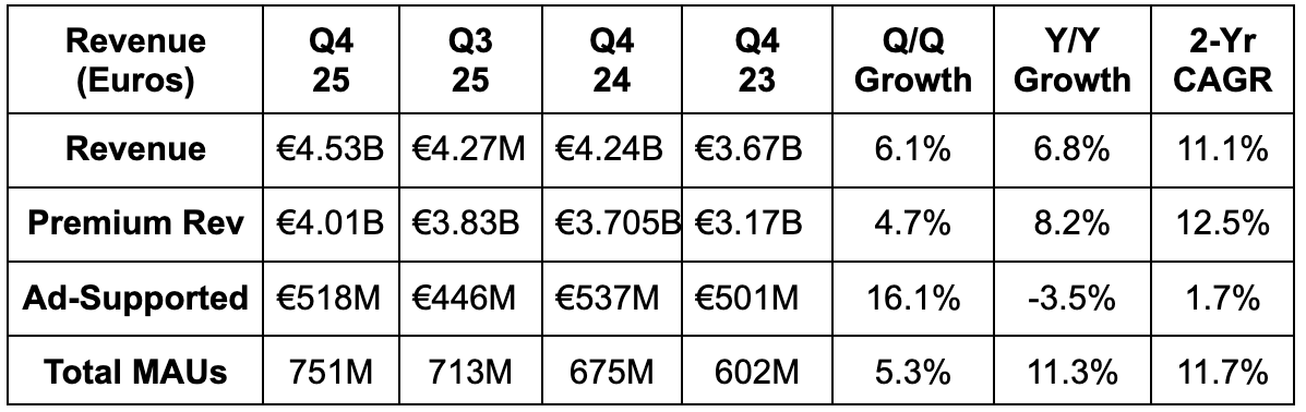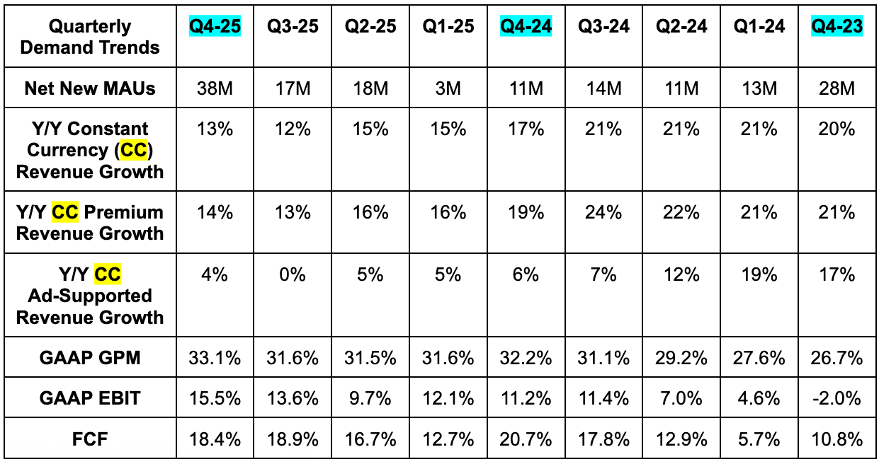 - Beat 289M premium subscriber estimate & identical guidance by 1M each.