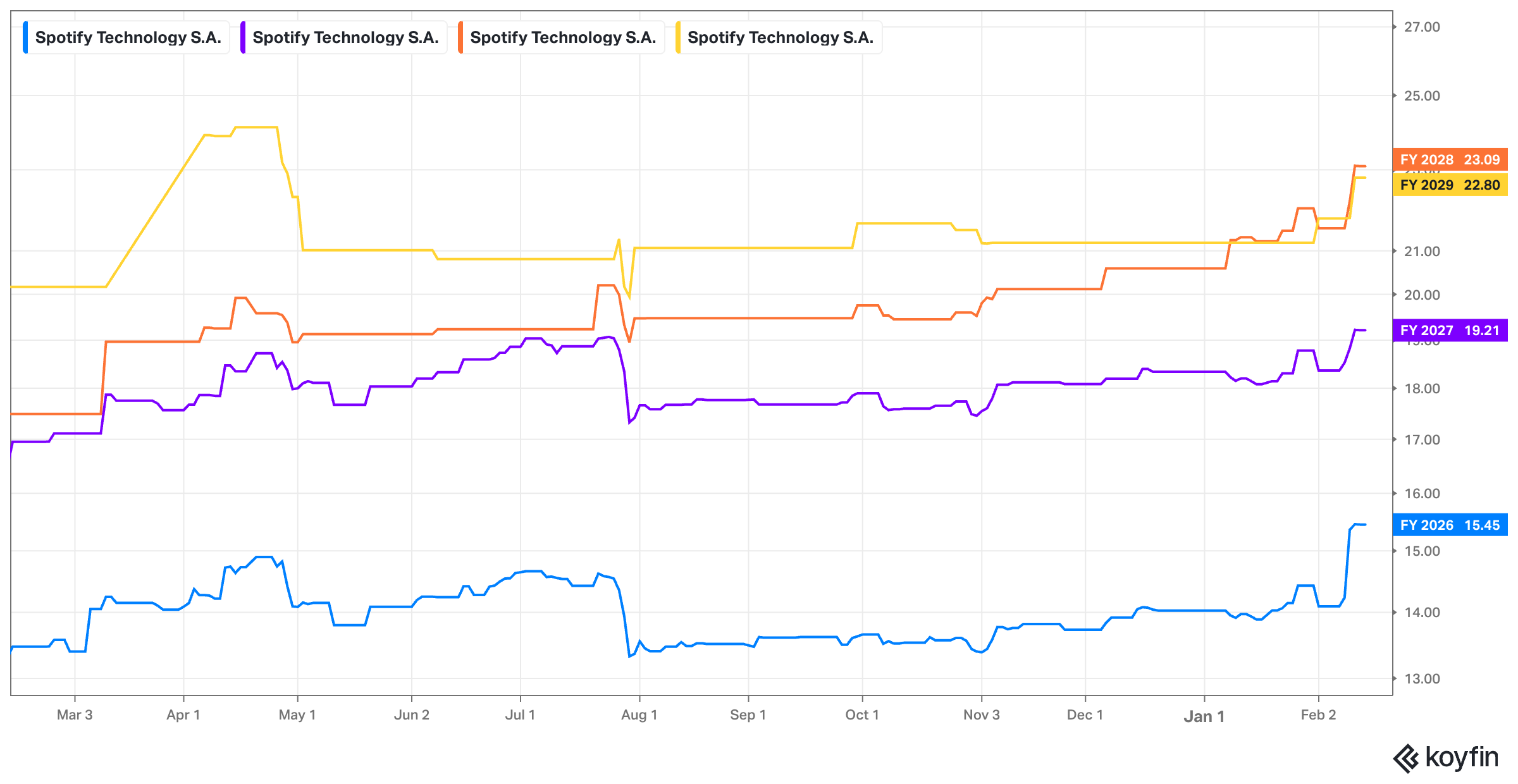 SPOT trades for 24x forward EBIT and 22x forward FCF. EBIT is expected to grow by 39% this year and by 27% next year. FCF is expected to grow by 24% this year and by 23% next year.