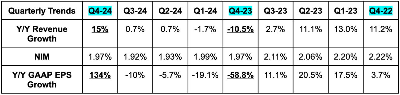- Beat $0.82 EPS estimates by $0.05. EPS doubled Y/Y due to the FDIC special assessment charged. Excluding this, EPS rose by 17% Y/Y. Just like for JPM and WFC, the FDIC charge also led to very easy Y/Y return metric comps.