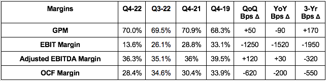 - REITERATED “flat or better” adjusted EBITDA margins safely implying a 35% margin or $1.20 billion in 2023 adjusted EBITDA. This met estimates as well.