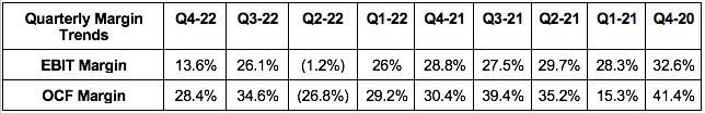 - Basic share count grew 2.7% YoY in 2022 (related to new CEO hire) while diluted count fell by 3.3%.