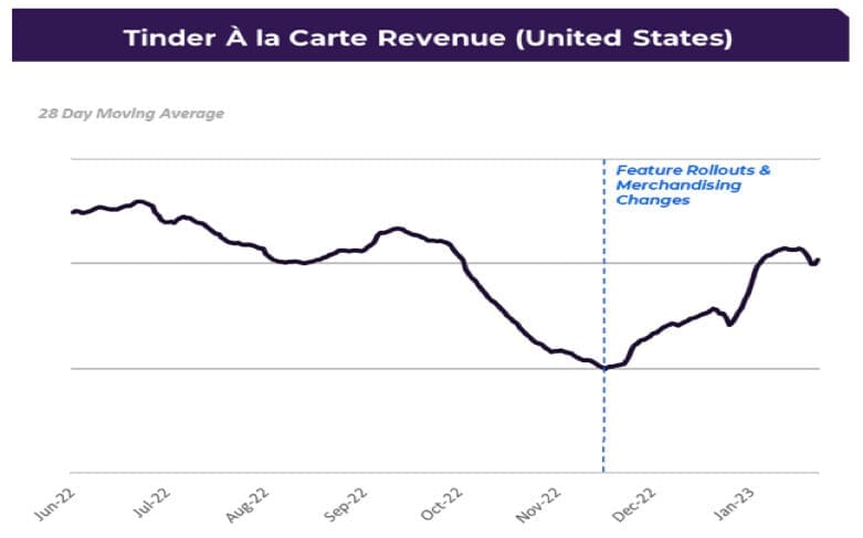 As evidence of new product initiatives working and the new team executing, Tinder -- through new perks like dynamic subscription offer surfacing, granular profile descriptions and Primetime Boosts -- reversed a negative trend in à la carte revenue. Match has seen encouraging stabilization to à la carte over the last several months: