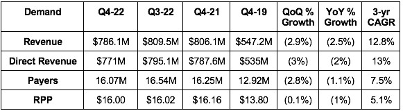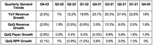 - Revenue Per Payer (RPP) was hit by an 800 bps FX headwind with that most pronounced in APAC. RPP actually rose 7% YoY FX neutral.