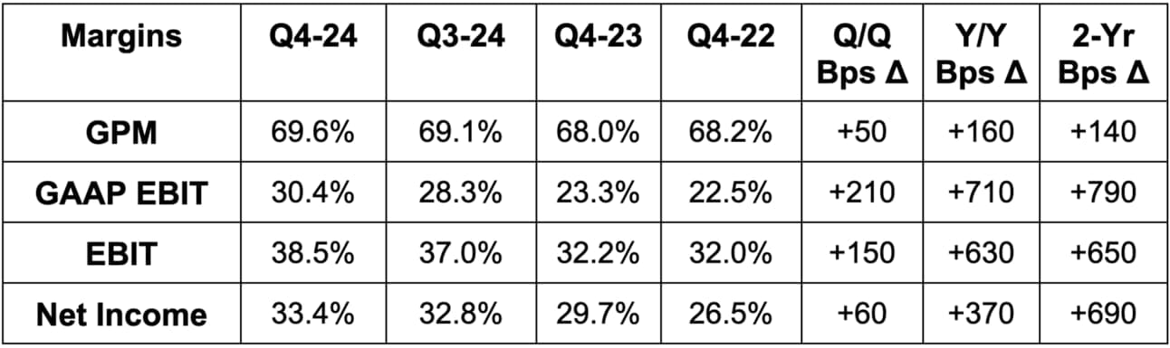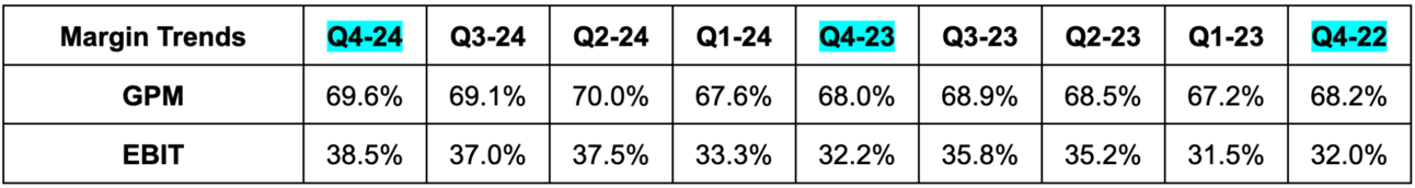 It also expects a 67.5% GPM, which missed 68.3% estimates. Tariffs, which weren’t included in guidance, could negatively impact GPM. Finally, it expects about 12.5% Y/Y operating expense growth vs. about 10% growth in 2024. Based on current estimates, analysts expect 16% EPS compounding over the next two years. I think profit estimates will slightly decline following this report.