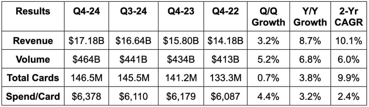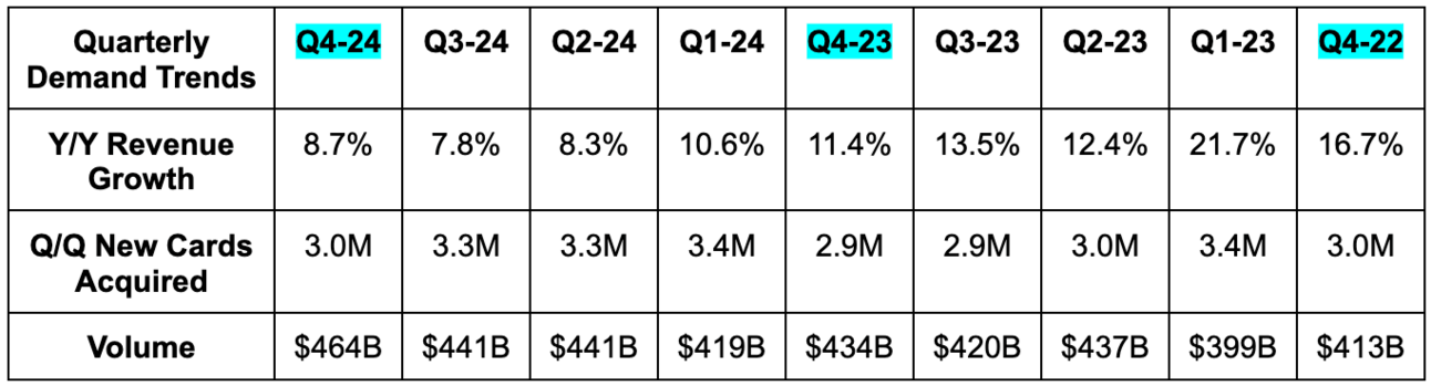 “We continue to make strides in our International business… Q4 spend results were strong across our businesses, and we feel good about the spend acceleration we saw. While growth in Q1 will be impacted by the grow-over from leap year in 2024. So far, the first 3 weeks of January look more in line with Q4 trends.”