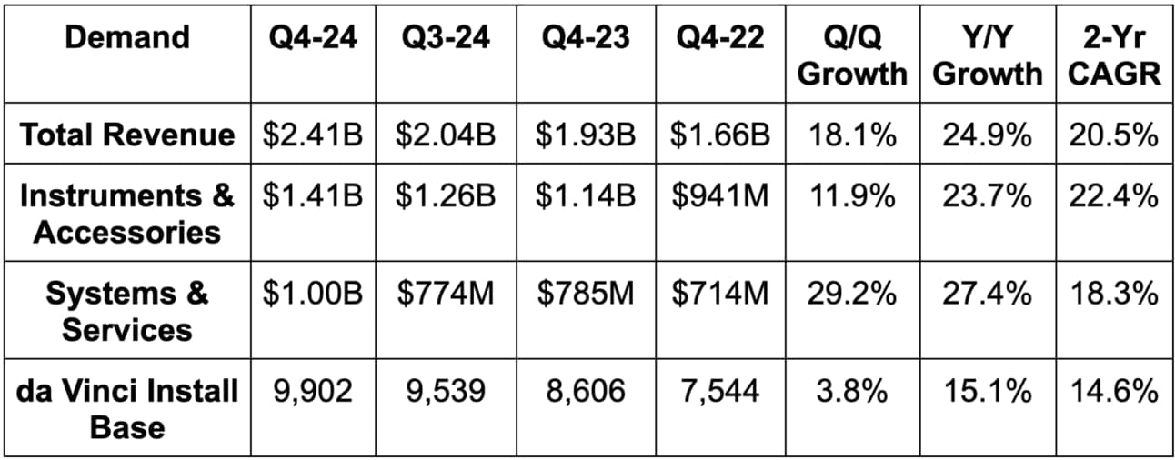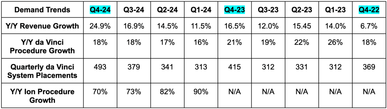 ISRG reiterated the same 2025 guidance that it provided in its preliminary earnings release. It expects 14.5% Y/Y procedure growth for da Vinci vs. about 15% to 16% growth expected by analysts (depending on the source). ISRG is a consistent guidance sandbagger – especially when offering new annual guidance. Systems revenue is expected to rise due to a mix shift away from leased machines to outright purchased machines, while average selling price is also expected to rise Y/Y.