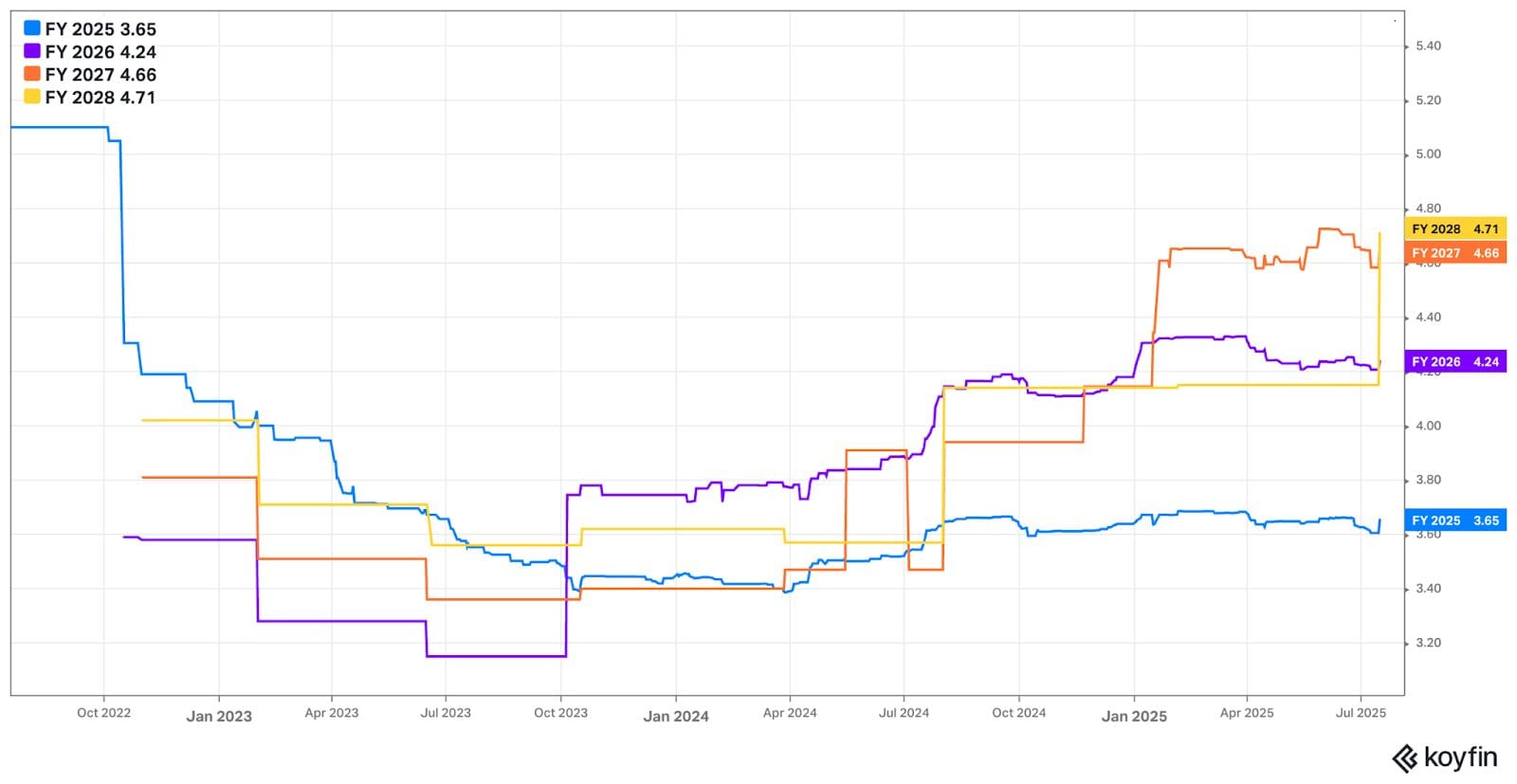 Amazon told the public that the 4-day Prime event surpassed any 4-day period in its history that included a shopping event. I’d hope so. This is the first time they’ve extended this event from 2 to 4 days, so not surpassing previous records would have been significantly concerning. Good to hear that didn’t happen. Perhaps more importantly, Adobe reported 30.3% e-commerce industry growth over that period of time, which is materially better than its 28.4% estimate. Considering Amazon owns nearly half of the U.S. ecommerce market and consistently takes market share, it’s reasonable to assume outperformance for everyone likely means solid results for Amazon as well. EPS estimates for 2025 have ever-so-slightly ticked higher since the event, but candidly, we could call that positive movement a rounding error.