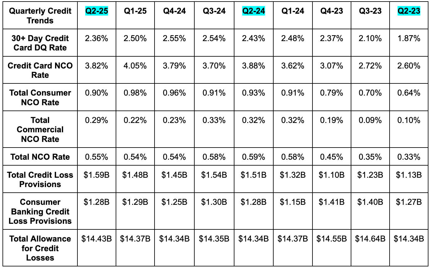 - Strong credit card delinquency and net charge-off (NCO) data bodes well for today and next quarter.