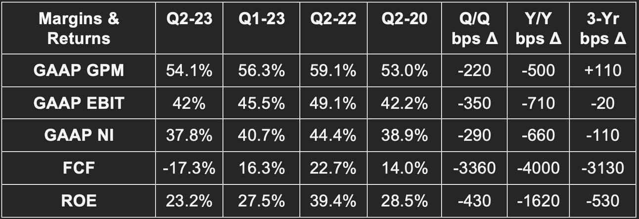 Guidance for next quarter was light across the board. It missed on revenue by a modest 0.6%, missed on 53.5% GAAP GPM estimates by 100 bps and missed forward EBIT estimates by 6.7%.