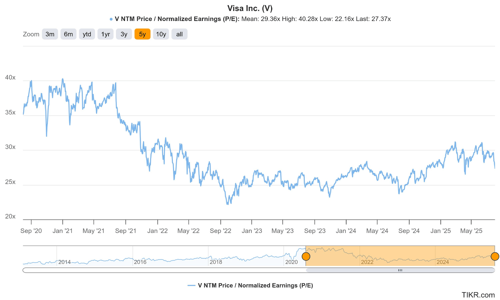 Visa trades for 27x forward EPS. EPS is expected to rise by 14% this year and by 12% next year.