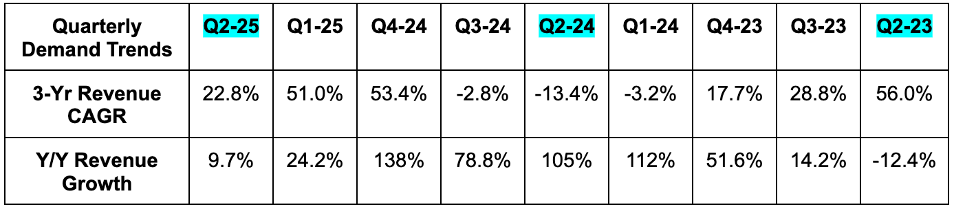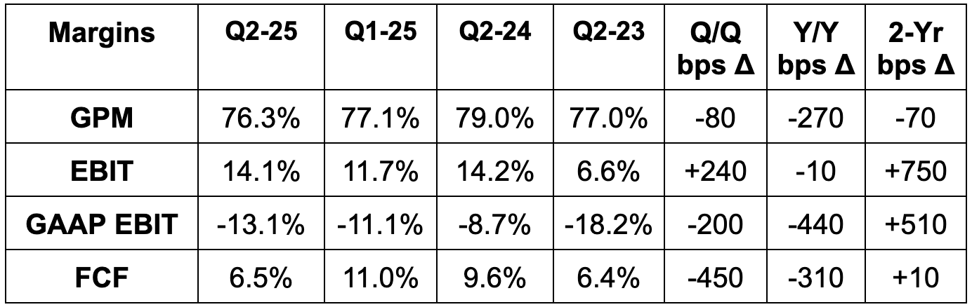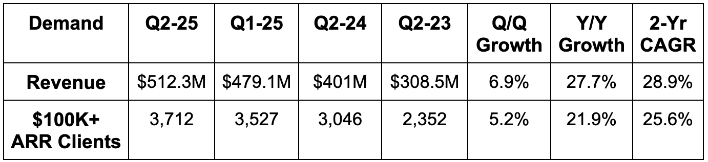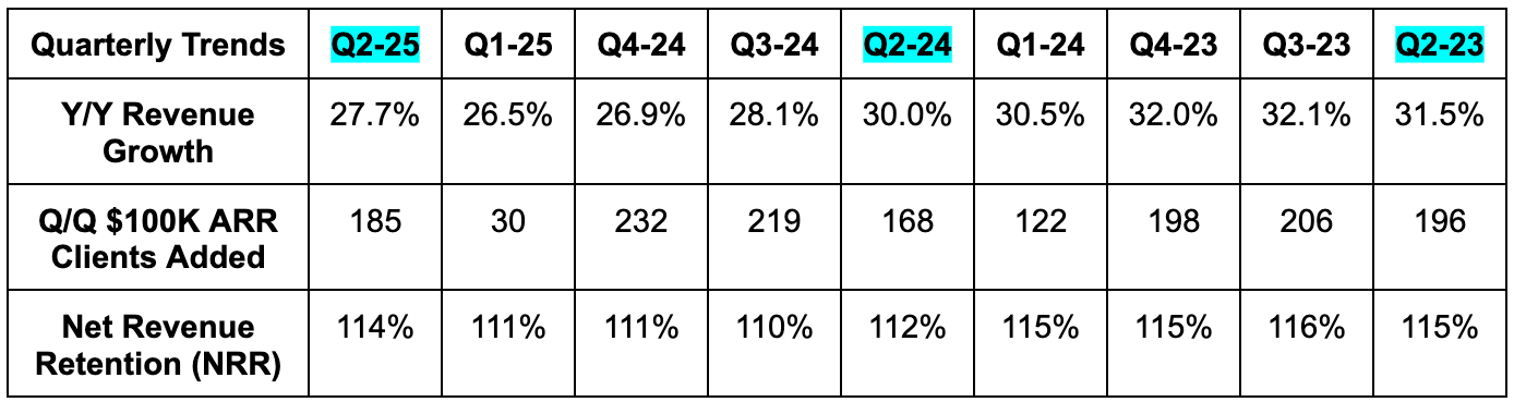 - Beat 111% net revenue retention (NRR) estimates by 3 points. This was its best NRR quarter since Q1 2024.