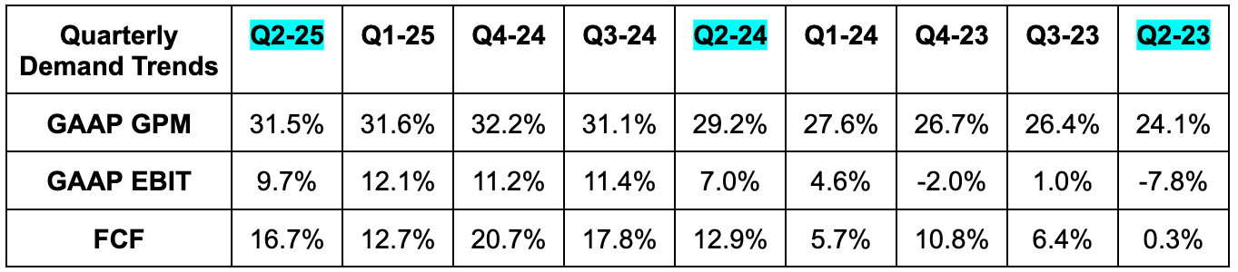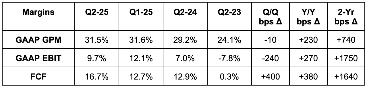 - Gross profit margin met 31.5% estimates & identical guidance.
