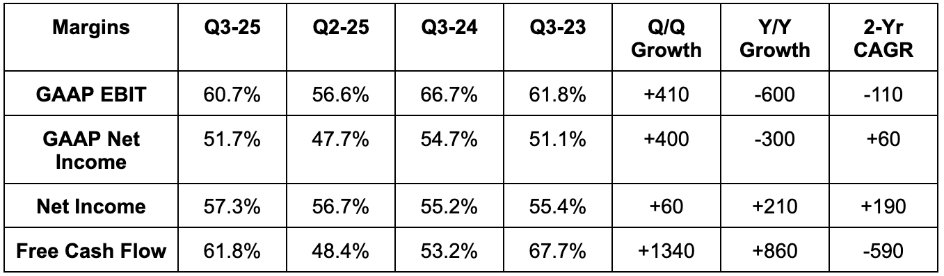 - Sharply beat GAAP EPS estimates. This line item is highly influenced by mark-to-market gains/losses on equity investments. It recorded a $1.5B gain this quarter, which is 103% of total net income for the period. Best to ignore GAAP EPS for this company and focus on other profit metrics.