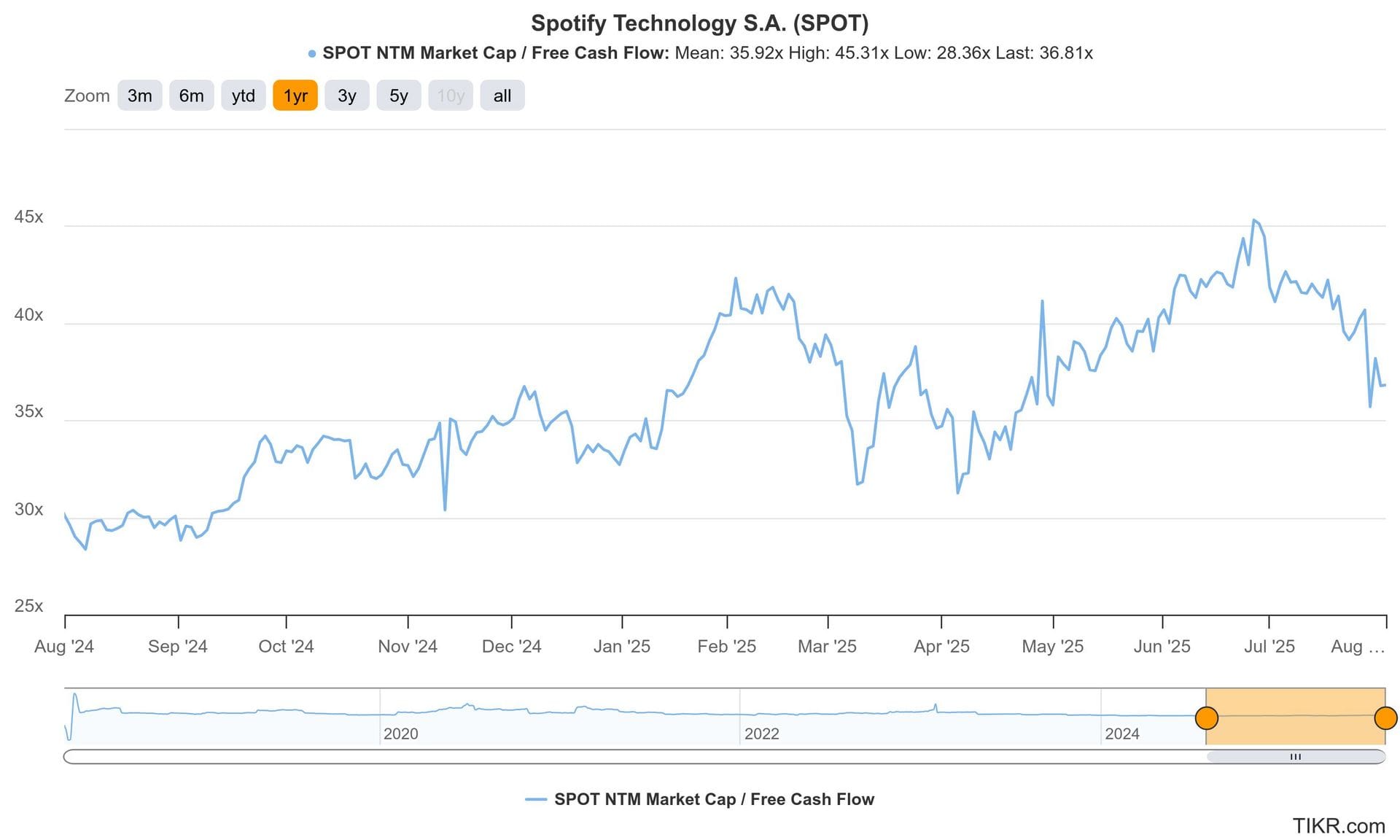Spotify trades for 37x forward FCF. FCF is expected to grow by 19% this year and by 25% next year.