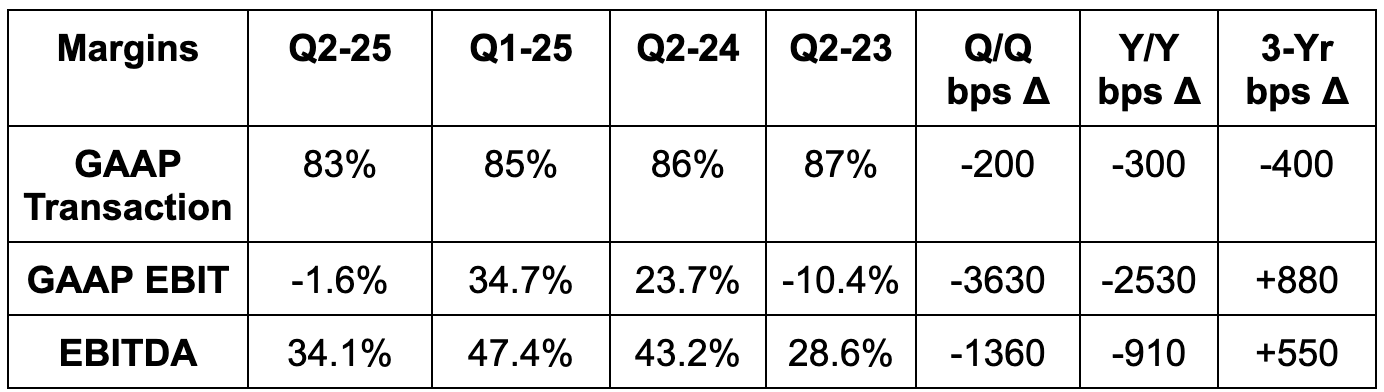 - Came in at the low end of transaction margin guidance calling for transaction expenses at a mid-single-digit % of revenue.