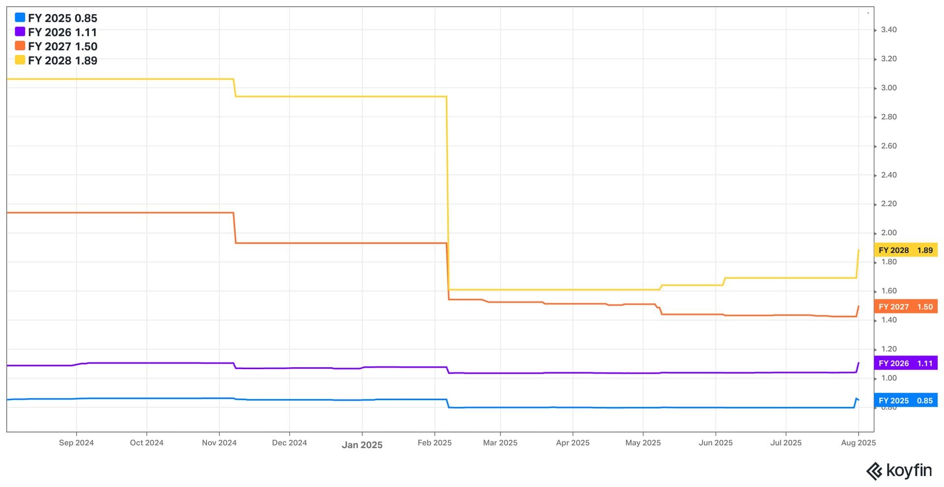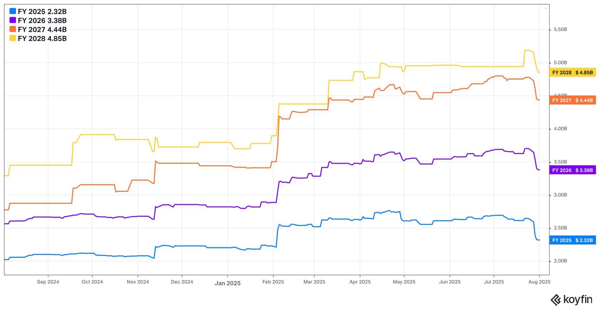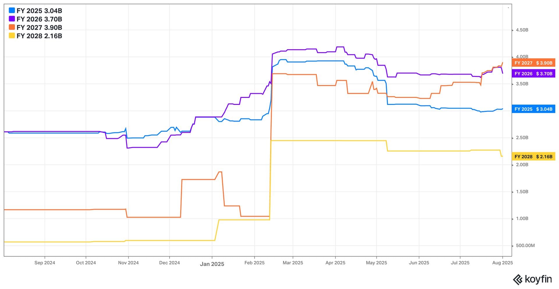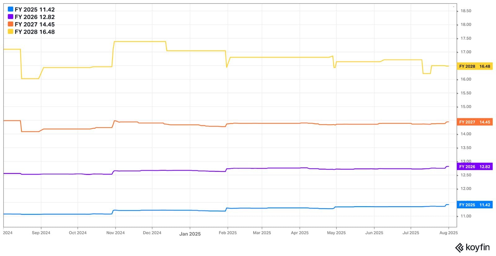 Visa guides to FXN growth rather than nominal growth. For Q4 2025, it guided to roughly 10% revenue growth and 7%-9% EPS growth. Revenue estimates were stable following this news; EPS estimates fell from $3.01 to $2.96. 2026 sales and profit estimates actually both rose a tad.