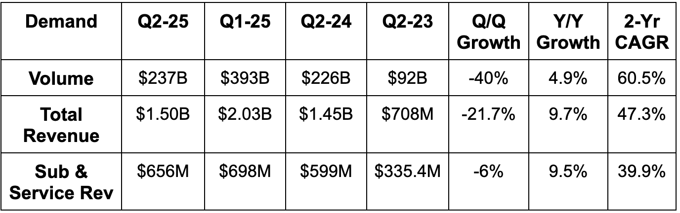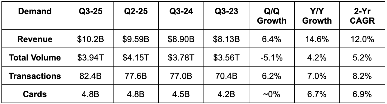 - As a relevant aside, Mastercard volume growth was stable Q/Q in both the USA and internationally. USA growth was again 7% Y/Y, while international growth was 14% Y/Y. Through July 28th, USA volume growth has accelerated to 8% Y/Y; international growth has decelerated to 13% Y/Y.
