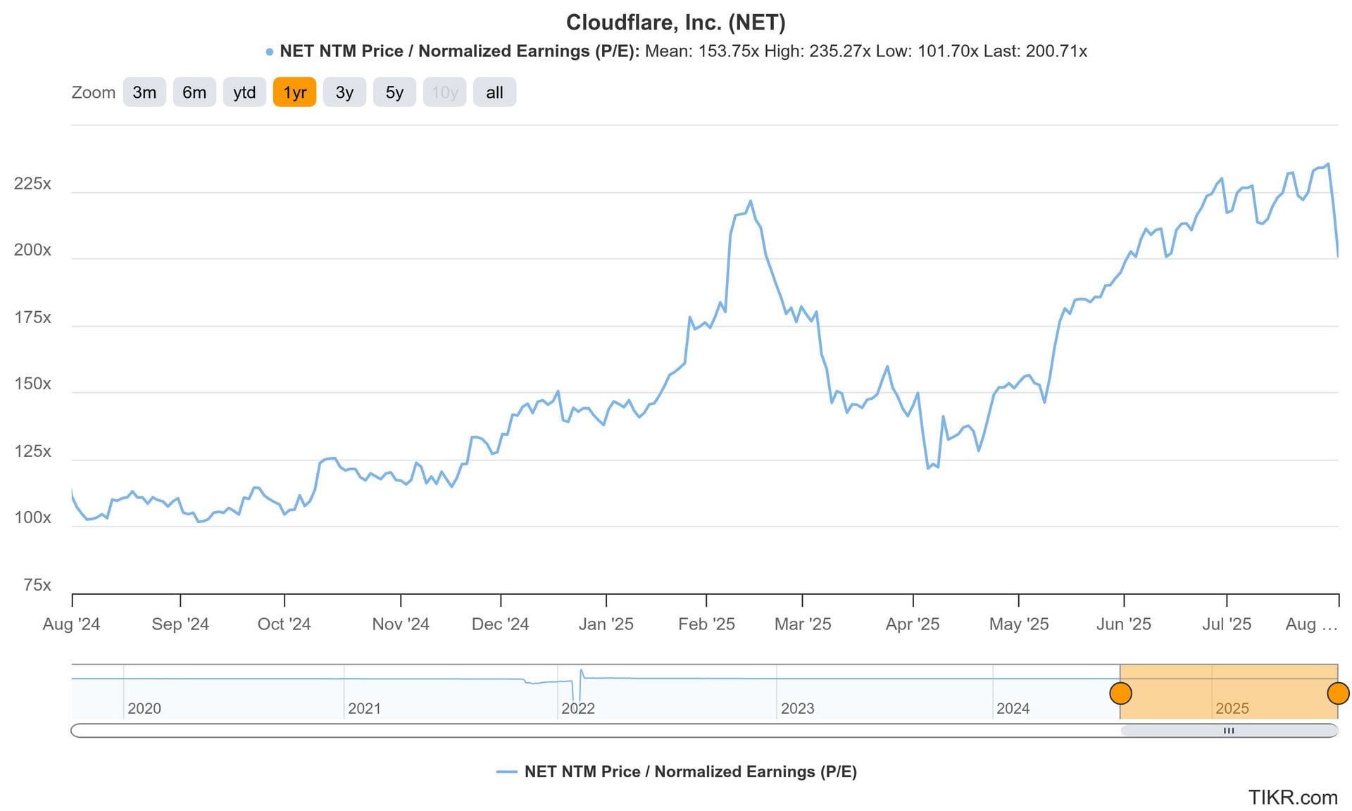 Cloudflare trades for 200x forward EPS. EPS is expected to grow by 13% this year and by 30% next year. It also trades for 219x forward FCF. FCF is expected to grow by 52% this year and by 39% next year. Very expensive name. Has been since the IPO.