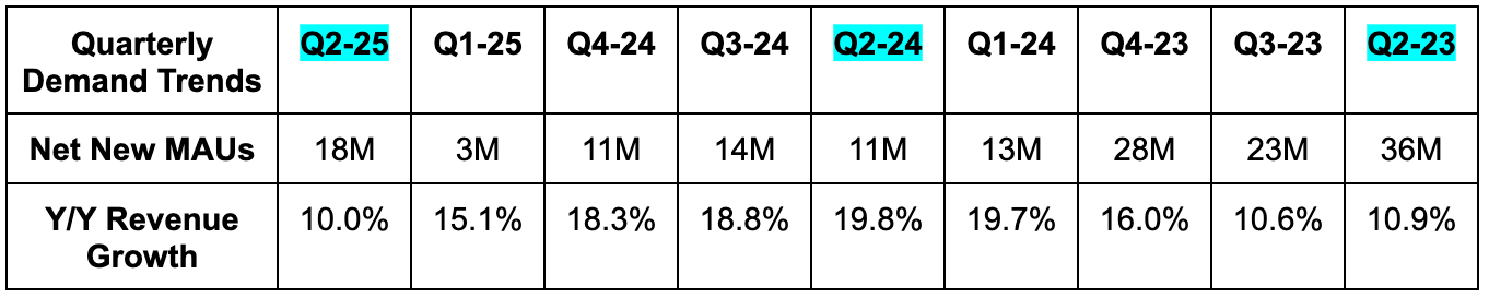 - Beat Monthly Active Users (MAUs) estimates by 1% and beat guidance by 1% as well.