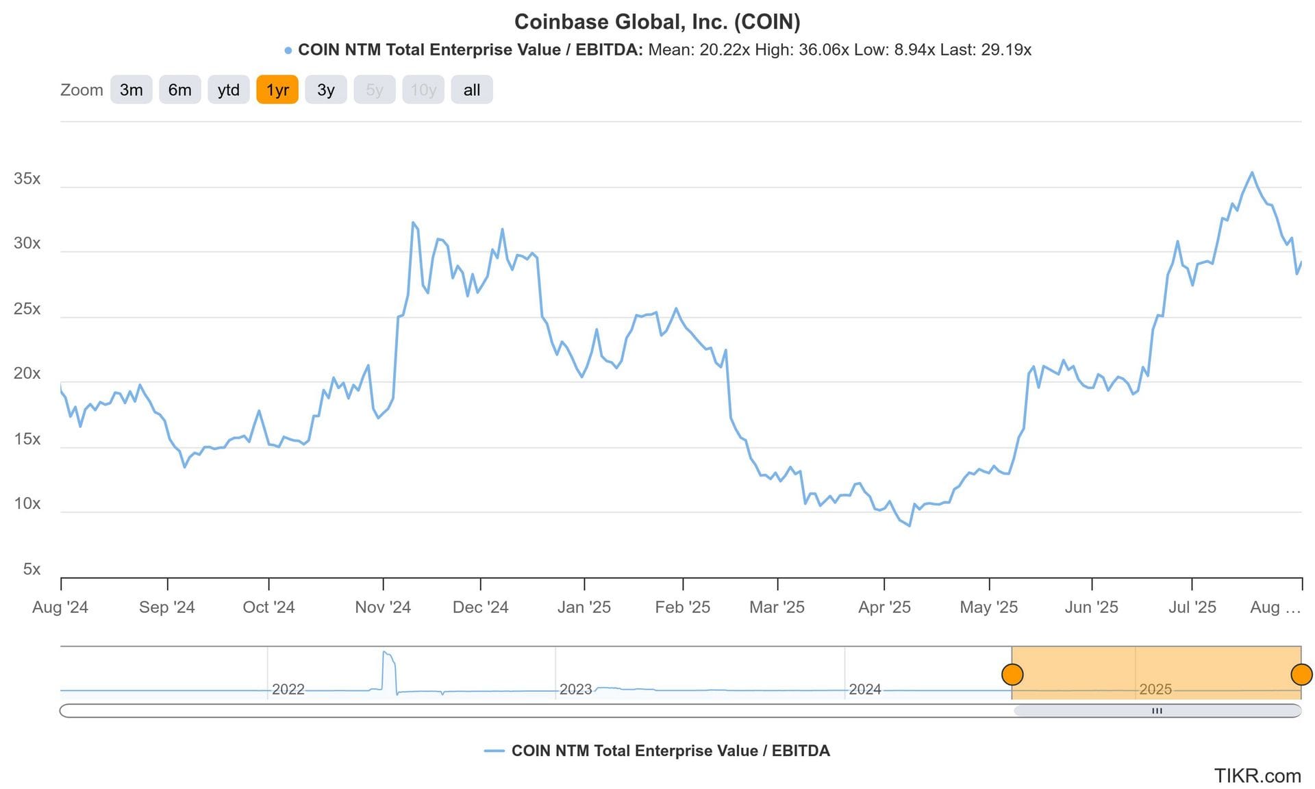 COIN trades for 29x forward EBITDA. EBITDA is expected to fall by 9% this year (following 300%+ compounding for 2 years) and grow by 22% next year.