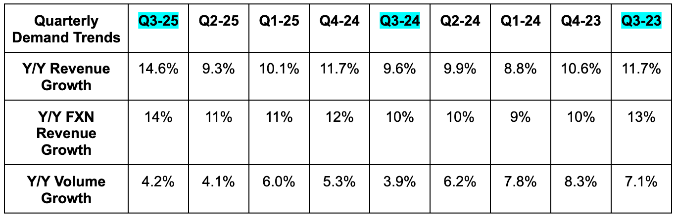 - International payments volume rose by 10% Y/Y FXN compared to 9% FXN last quarter.