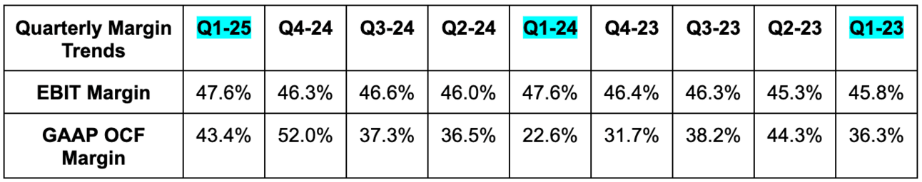 - Diluted share count fell 4% Y/Y; basic share count fell 3.3% Y/Y. They’ve really picked up the buyback pace amid the recent stock decline.