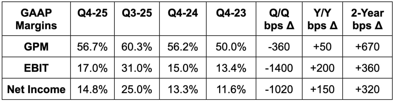- Beat EBIT estimate by 8.8% & beat 28% EBIT margin guidance by 220 bps. A moderated pace of hiring helped drive the beat.