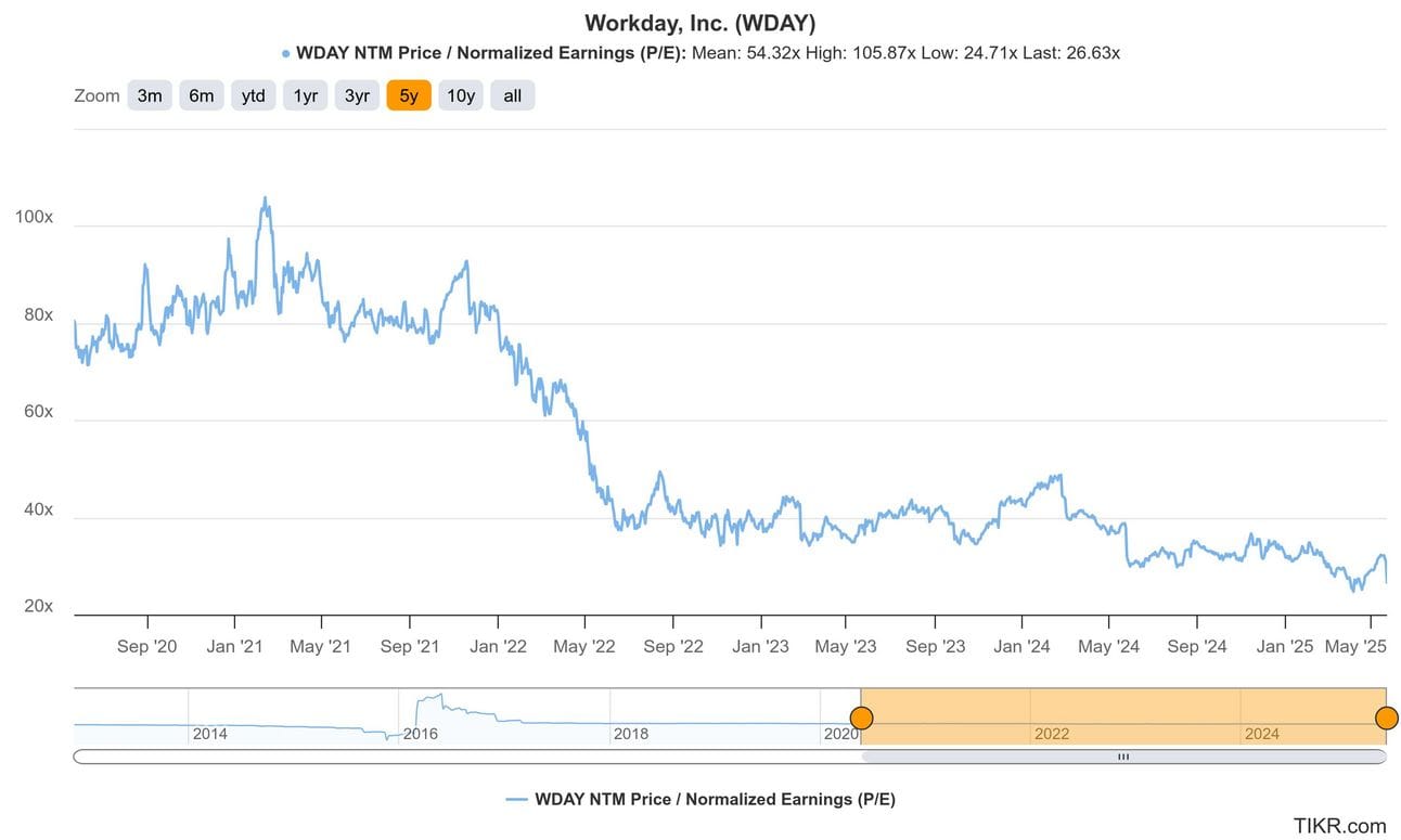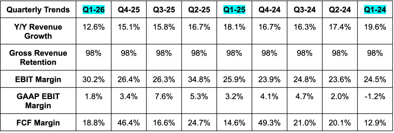 - Workday reiterated annual subscription revenue guidance, implying slightly lower Q2-Q4 expectations (considering the small Q1 beat). They seem to be approaching macro cautiously. 28% EBIT margin guidance was also reiterated and in line with expectations.