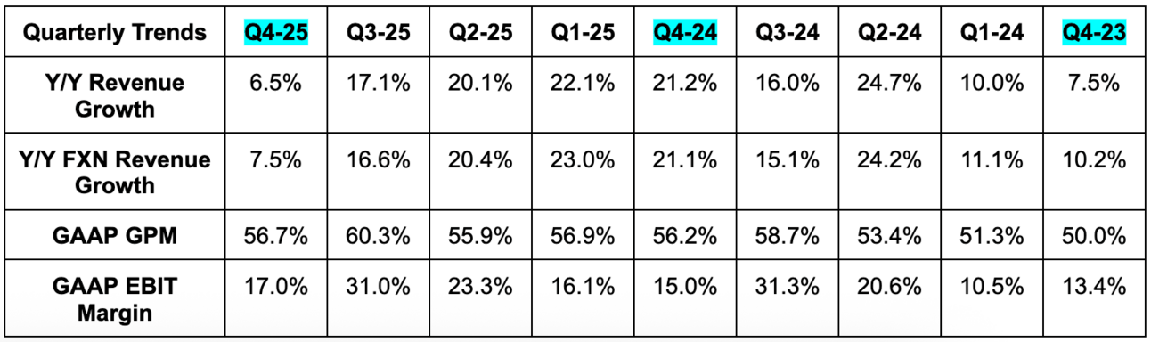 - Estimates shifted to reflect currency favorability during the quarter. Revenue grew 7.5% Y/Y FXN.