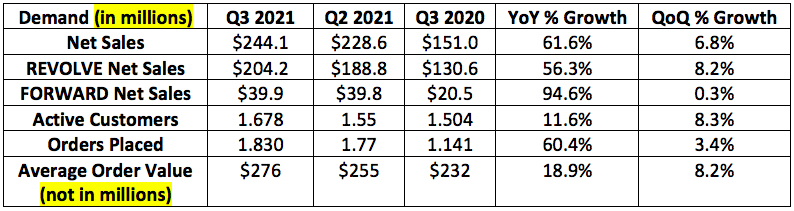 Note that Average order value (AOV) is getting a boost from FORWARD’s proliferation — FORWARD is one of REVOLVE’s core, luxury owned-brands.