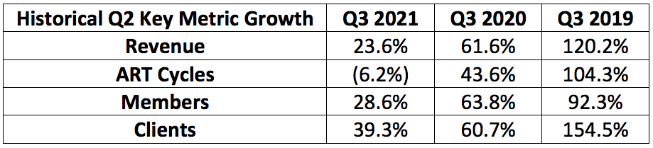 Progyny’s revenue guide represents 48% growth at the midpoint for 2021. Encouragingly, it expects revenue growth to accelerate in 2022 to 50%. That would bring us to north of $770 million in sales which is roughly in line with analyst forecasts. Incoming CEO Peter Anevski told us that this guide assumes the current slightly-depressed utilization rate continues — this rate did not rebound as quickly as it needed to for Progyny to maintain or raise its guide. It does not assume any further improvement meaning any improvement could place upward pressure on that guidance.